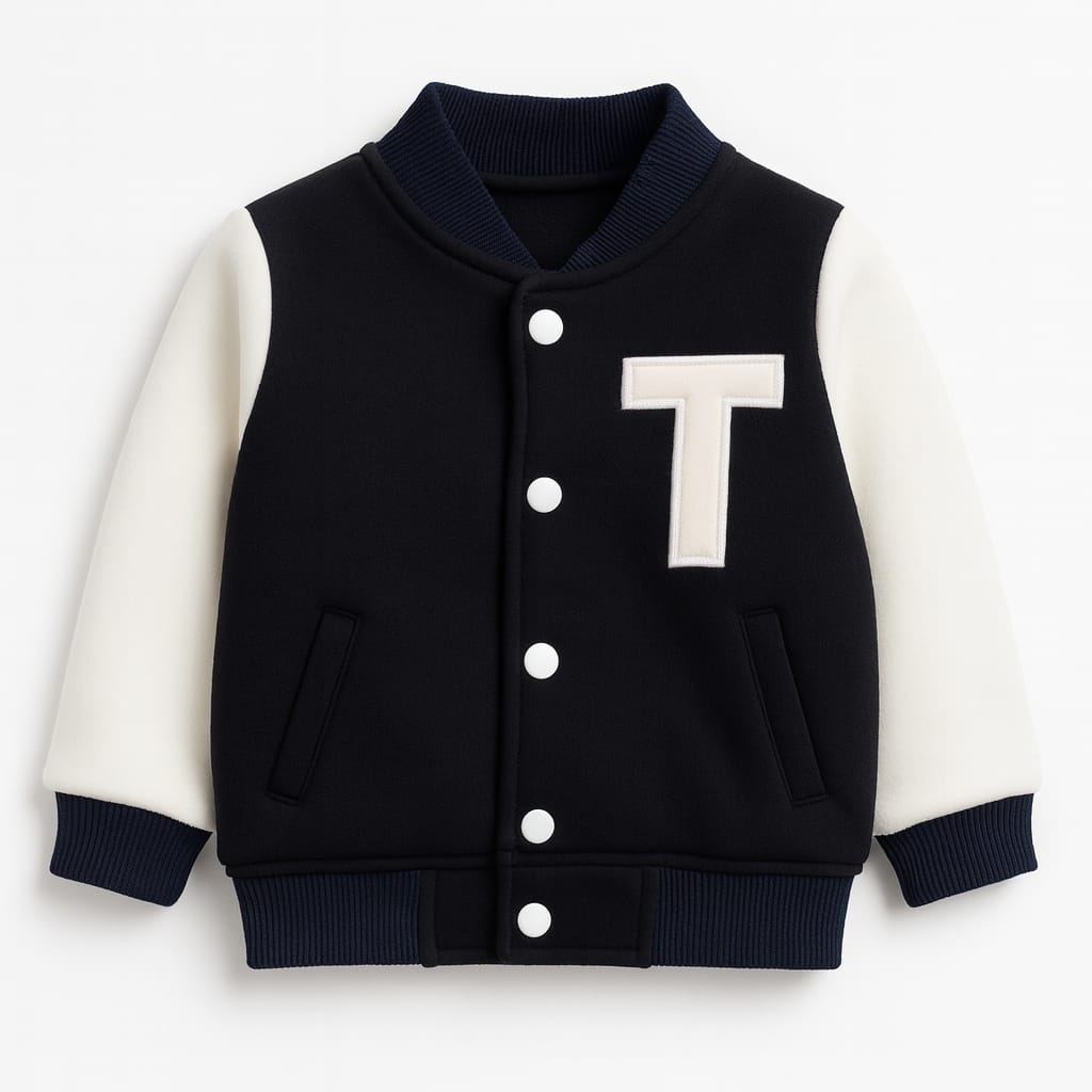 Cozy, stylish & timeless! 🖤🤍 This black & white fleece varsity jacket keeps kids warm and trendy. Ages 1–10 years, soft fleece body with contrast sleeves, snap buttons, and chest “T” patch for that classic cool look. Perfect winter outerwear for boys & girls in Pakistan.