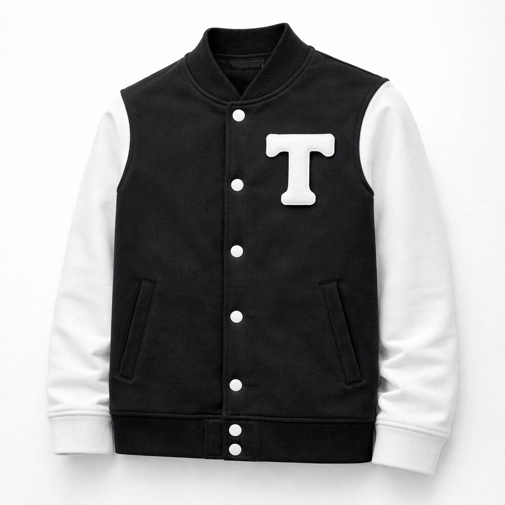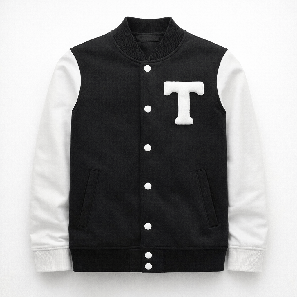 A sleek twist on the classic varsity look — meet our Signature Black & White Varsity Jacket. Featuring soft white sleeves, a smooth black body, and a raised T letter patch, this lightweight fleece jacket delivers both comfort and style in every wear.